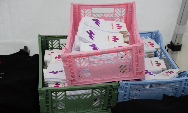Pitkävartiset tennissukat ovat muodissa ja niitä käytetään muuallakin kuin urheillessa. Suosituin sukan värivaihtoehto on valkoinen, johon on helppo kutoa oma logo. Merch-tuotteeksi kannattaakin valita tuotteita eri hintakategorioissa, joten sukka on edullinen vaihtoehto myytäväksi tapahtumissa tai brändin oheistuotteena.